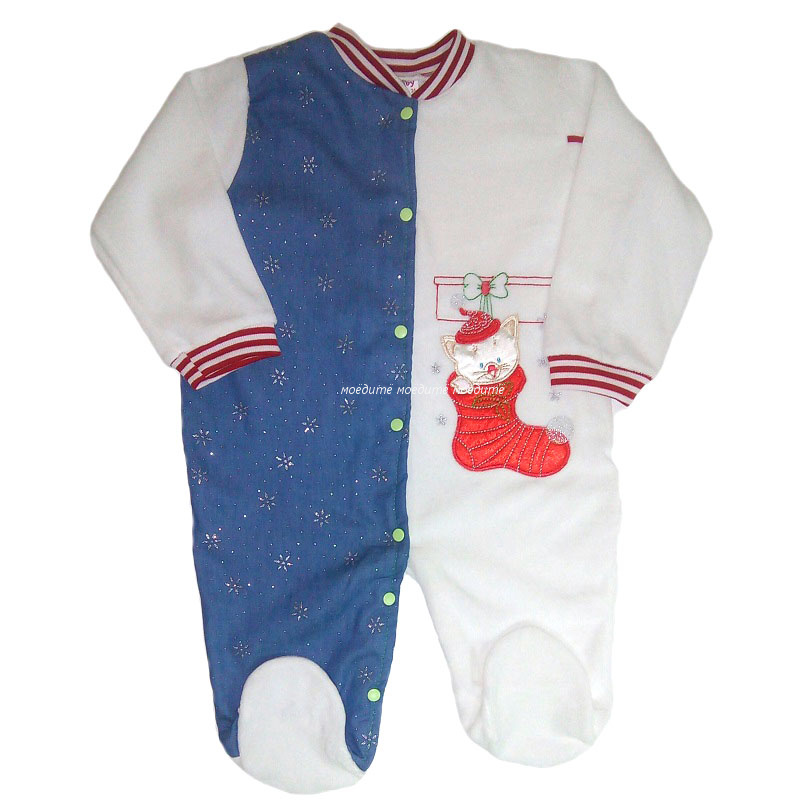Комбинезон без воротничка, с закрытыми ножками, с рукавами на манжете, спереди и между ножек на кнопочках. Сзади комбинезон однотонный белый из велюра, спереди одна полочка выполнена из джинса и украшена накаткой серебристого цвета в виде цветочков, на второй полочке в виде украшения используется аппликация.