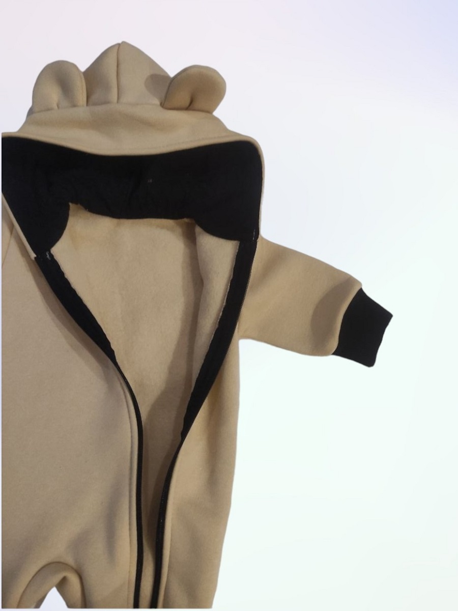 "МоёДитё" комбинезон выполнен из футера с начёсом. Комбинезон с капюшоном на подкладке и декорирован сверху ушками, с закрытыми ножками, рукава на манжетах, спереди косая молния до конца одной ножки. Шапочка из кашкорсе можно одевать как с отворотом, так и без. Очень хорошо тянется.